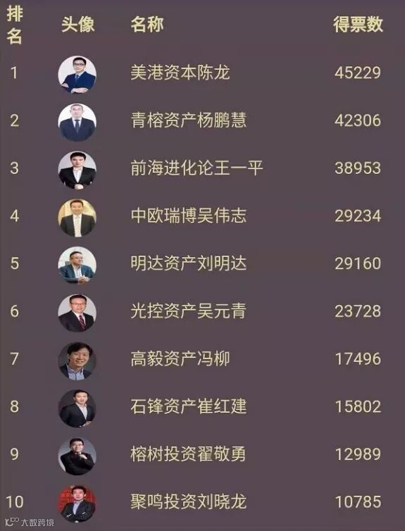 美港资本陈龙、青榕资产杨鹏慧、前海进化论王一平、中欧瑞博吴伟志、明达资产刘明达、光控资产吴元青、高毅资产冯柳、石锋资产崔红建、榕树投资翟敬勇、聚鸣投资刘晓龙。