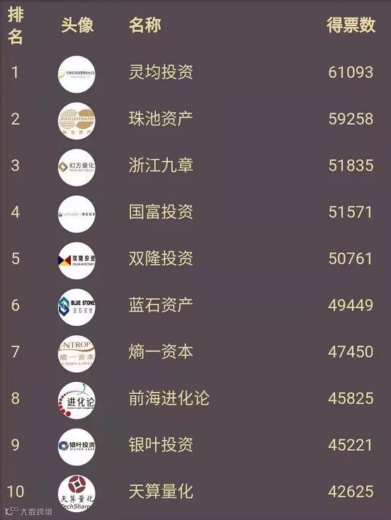 灵均投资、珠池资产、浙江九章、国富投资、双隆投资、蓝石资产、熵一资本、前海进化论、银叶投资、天算量化。