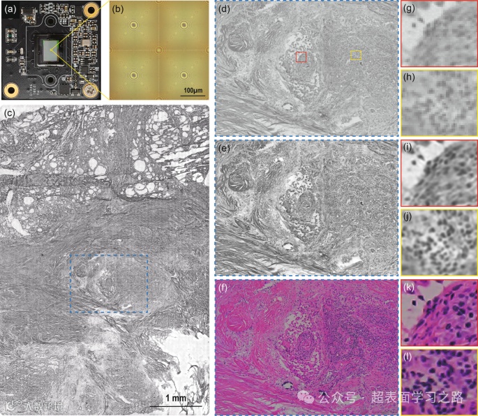 在显微成像系统不断向微型化、片上化发展的过程中,最大瓶颈来自两个物理限制:其一,成像系统越小,往往越难同时兼顾视场和分辨率;其二,当超构透镜直接贴合在图像传感器上时,虽然可以省去传统显微镜中厚重的物镜组,但成像分辨率随之被严格锁死在传感器像素尺寸上,像是“用一支极细的笔在方格纸上作画”,再高的光学质量也会被像素采样不足所限制。现有方案若想提升分辨率,要么增加物镜放大倍率、牺牲视场;要么更换更小像素的传感器,成本高昂;要么引入复杂的多级光路,违背了微型化初衷。针对这些看似无法兼得的限制,南京大学陈晨|李涛|祝世宁院士团队提出了一种由超构透镜与Transformer神经网络协同实现的“计算式亚像素分辨显微框架”,让成像系统像“在固定像素网格下自动补绘细节的智能画师”,在单帧成像的前提下突破像素分辨率极限。论文中,团队首先构建了全球首个由超构透镜采集的真实甲状腺病理切片数据集,通过一对1×与3×超构透镜成像系统采集3000组成对图像,使网络学习“低分辨输入→高分辨真值”的映射关系。实验结果显示,在110 微米×110 微米视场内,Transformer模型可在约0.2 秒内完成单帧重建,结构相似度可达0.91,峰值信噪比达30 dB,相比双三次插值提升7.24 dB;重建的细胞结构与3×超构透镜真实成像分辨率(0.87 微米)高度一致。进一步地,当模型应用于20×30超构透镜阵列后,仅用9次平移扫描便获得4 毫米×6 毫米的大视场图像,其有效成像面积约为传统10×/0.25 NA奥林巴斯物镜的14.5倍,而局部分辨率与其表现近乎一致,实现了“超大视场+高分辨率+超薄光学”的统一。同时,该系统还成功区分了正常与疑似癌变的甲状腺区域,为未来的片上病理诊断提供了实证基础。该成果以 Transformer-based neural network enabled subpixel-resolution in wide-field meta-microscope 为题,于2025年12月3日发表于《PhotoniX》。