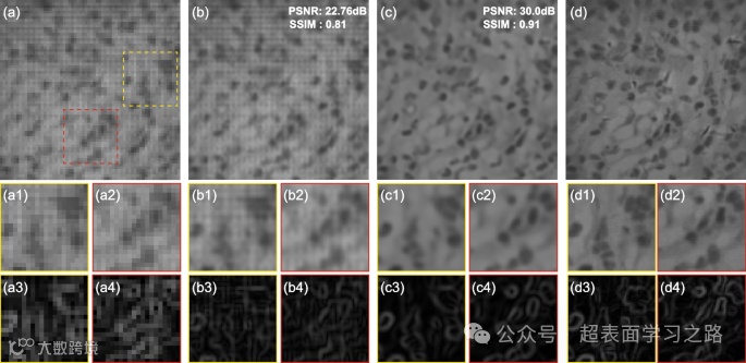 (a) 由超构透镜(1×)拍摄的网络输入图像。高亮区域为两个具有代表性的兴趣区域(ROI)。