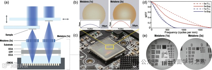 (d) 超构透镜(1×)和超构透镜(3×)的实验与理论极限MTF。e 使用超构透镜(1×)和超构透镜(3×)拍摄的USAF分辨率测试卡的成像结果。