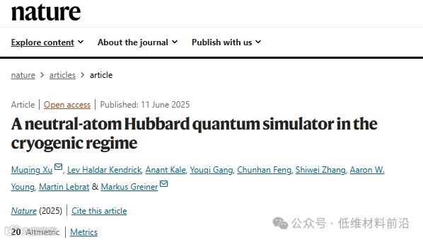 相关研究成果以「A neutral-atom Hubbard quantum simulator in the cryogenic regime」为题发表在Nature杂志上。该项研究不仅提升了冷原子量子模拟器的制冷效率和系统规模,也展示了量子模拟技术解决复杂多体问题的强大潜力,为未来揭示量子材料中尚未理解的物理机理提供了新途径,推动了量子材料科学及相关技术的发展。