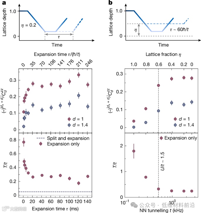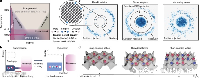 有鉴于此,麦克阿瑟天才奖得主/哈佛大学Markus Greiner课题组、徐穆清携手设计并制备了一个能够动态调控晶格结构和哈伯德模型参数的冷原子实验系统,通过创新的制备方法将低熵的绝缘体乘积态转化为强关联系统,实现了哈伯德模型中极低温度状态的制备。利用精确控制的光学晶格和数字微镜器件(DMD)形成的可编程光学势场,团队成功扩大了系统规模至约340个格点,同时实现了温度大幅降低,达到了半填充时U/t约8条件下的最低实验温度。