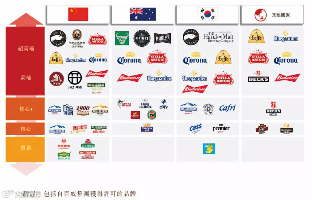 从产品结构看,百威亚太按照质量与价格将啤酒分为三类:高端及超高端品牌、核心及核心+品牌以及实惠品牌。受亚太地区的人均可支配收入的提高与城市化等宏观经济的影响,消费者正偏好更高端的啤酒类别以及贵价啤酒,高端及超高端类别品牌贡献了百威亚太绝大部分收入。
