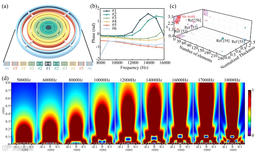 图6 水下宽带声聚束超透镜。(a) 构造的由11个优化单元组成的超透镜。(b) 六个最优单元在[8000Hz和16000Hz]内的优化相移。(c) 本工作与其他工作的对比。(d) 在[5000Hz和18000Hz]范围内的9个代表频率的模拟声振幅场。