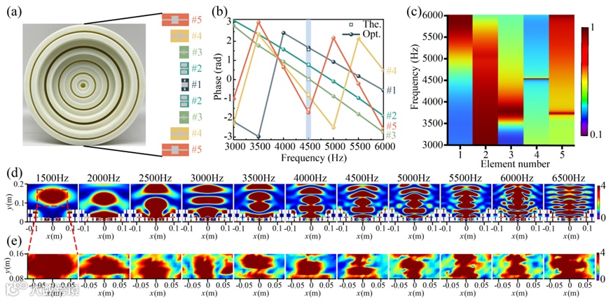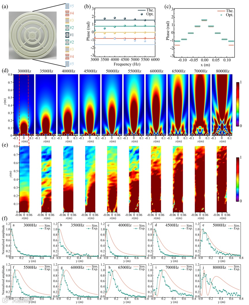图5 空气中的宽带声聚束超透镜。(a) 构造的由9个优化单元组成的超透镜。(b) 在[3000Hz和6000Hz]范围内五个不同最优单元的理论(The.)和优化(Opt.)相移。(c) 5000Hz下超透镜的整体理论(The.)和优化(Opt.)相移分布。在[3000Hz和8000Hz]范围内十个代表频率下的模拟(d)和测量(e)声振幅场。红色虚线表示测量区域,大小为12×80 (cm×cm)。实测声振幅场测试间隔为2cm
