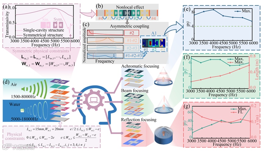 图1 超透镜的单元设计过程与非局部效应。(a) 单腔结构与对称结构在设计频率下的透射率。(b) 非局部效应示意图。(c) 非对称性耦合行为的物理原理。(d) 所设计的微型阵列超透镜在空气和水中的宽带范围。(e) 在空气中消色差声聚焦的超透镜在[3000Hz和6000Hz]内的最大幅值。(f) 在空气中声聚束的超透镜在[3000Hz和6000Hz]内的最大幅值和声束长度。(g) 在空气中声反射的超透镜在[3000Hz和6000Hz]内的最大幅值和焦距。