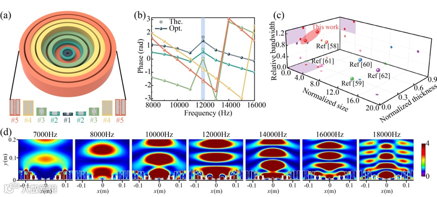 图8 水下宽带声反射超透镜。(a) 构造的由9个优化单元组成的超透镜。(b) 五个不同最优单元在[8000Hz和16000Hz]内的理论(The.)和优化(Opt.)相移。(c) 本工作与其他工作的对比。(d)在[7000Hz和18000Hz]范围内的12个代表频率的模拟声振幅场。