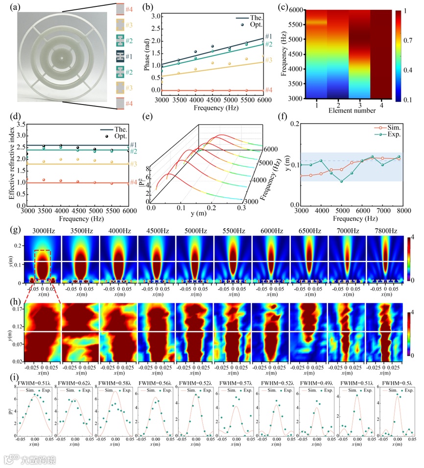 图3 空气中的宽带消色差超透镜。(a) 构造的由7个优化单元组成的超透镜。四种不同最优单元在[3000Hz和6000Hz]范围内的理论(The.)、优化(Opt.)相移(b)和有效折射率(d)。(c) 4种不同最优单元在[3000Hz和6000Hz]范围内的传输系数。(e) 在[3000Hz和6000Hz]范围内,y方向(x=0)上的模拟声压幅值分布。y值表示到超透镜的距离。(f) 在[3000Hz和7800Hz]范围内,模拟(红线)和实验(绿线)的焦点位置。在[3000Hz和7800Hz]范围内十个代表频率下的模拟(g)和测量(h)声振幅场。白色实线表示模拟的焦点深度,红色虚线表示实验测量域,大小为10×16 (cm×cm)。实测声振幅场的测试的距离间隔为1cm。对于相同的频率,模拟声场和实测声场采用不同的归一化尺度。对于不同频率的实测声场,使用不同的归一化尺度。(i) 焦平面内模拟(Sim.)和测量(Exp.)聚焦声场的声压振幅。