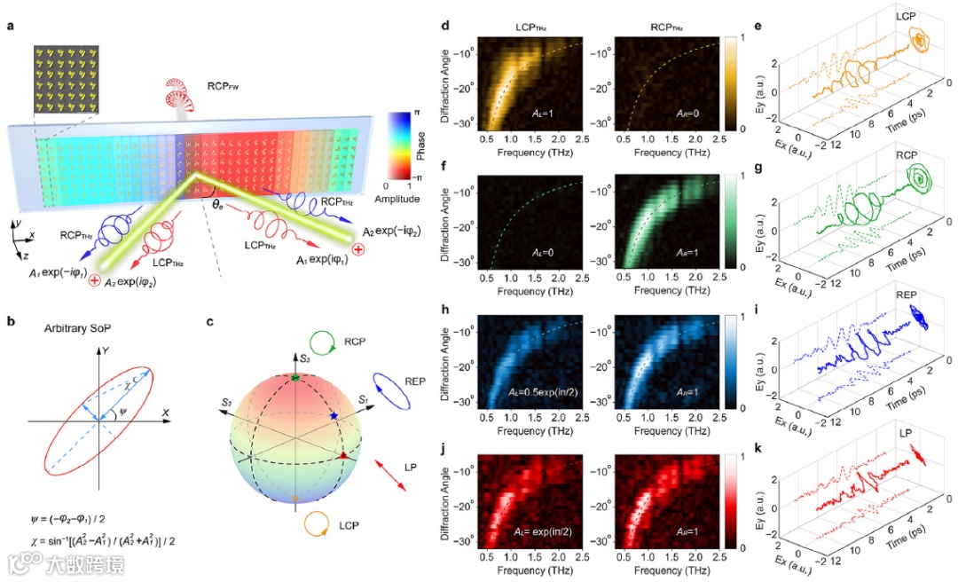 创新点:实现非线性超表面对THz波幅度、相位和偏振的同时完全控制。基于手性元原子的设计,使幅度控制与非线性PB相兼容独立;非交错超胞方法实现偏振态的任意定制,且控制具有线性可预测性,为多功能THz源发展奠定基础。