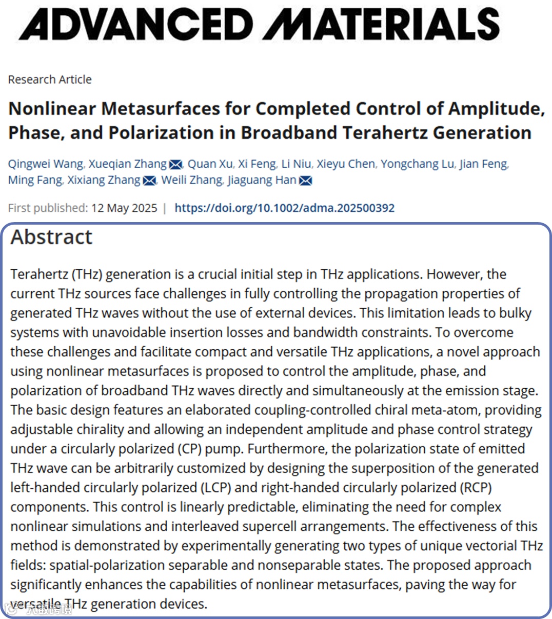 研究成果以题为“Nonlinear Metasurfaces for Completed Control of Amplitude, Phase, and Polarization in Broadband Terahertz Generation”发表于《Advanced Materials》上。天津大学Qingwei Wang为论文第一作者,天津大学Xueqian Zhang、Jiaguang Han和沙特阿卜杜拉国王科技大学Xixiang Zhang为论文共同通讯作者。