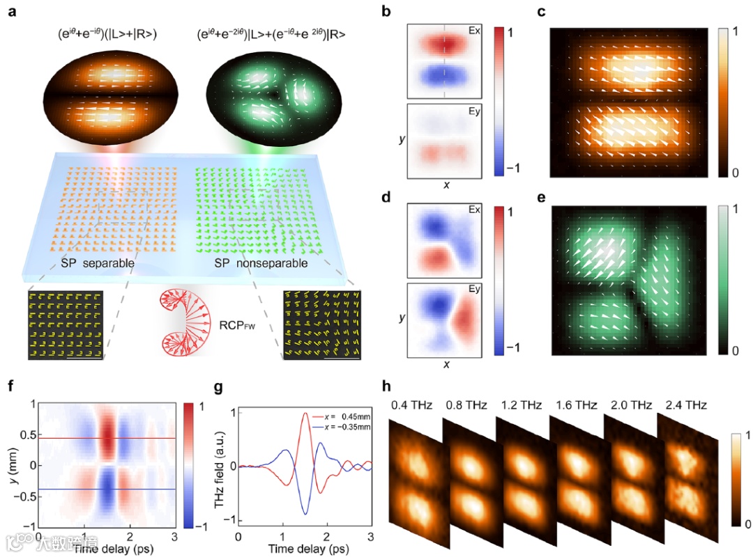 实现的效果:实验展示了对宽带THz波幅度、相位和偏振的完全控制,实现了空间-偏振可分离和不可分离的THz矢量场的产生。THz波的控制范围覆盖0.2-2.7THz,能生成多种偏振态的THz波,且在实验中验证了设计的有效性。