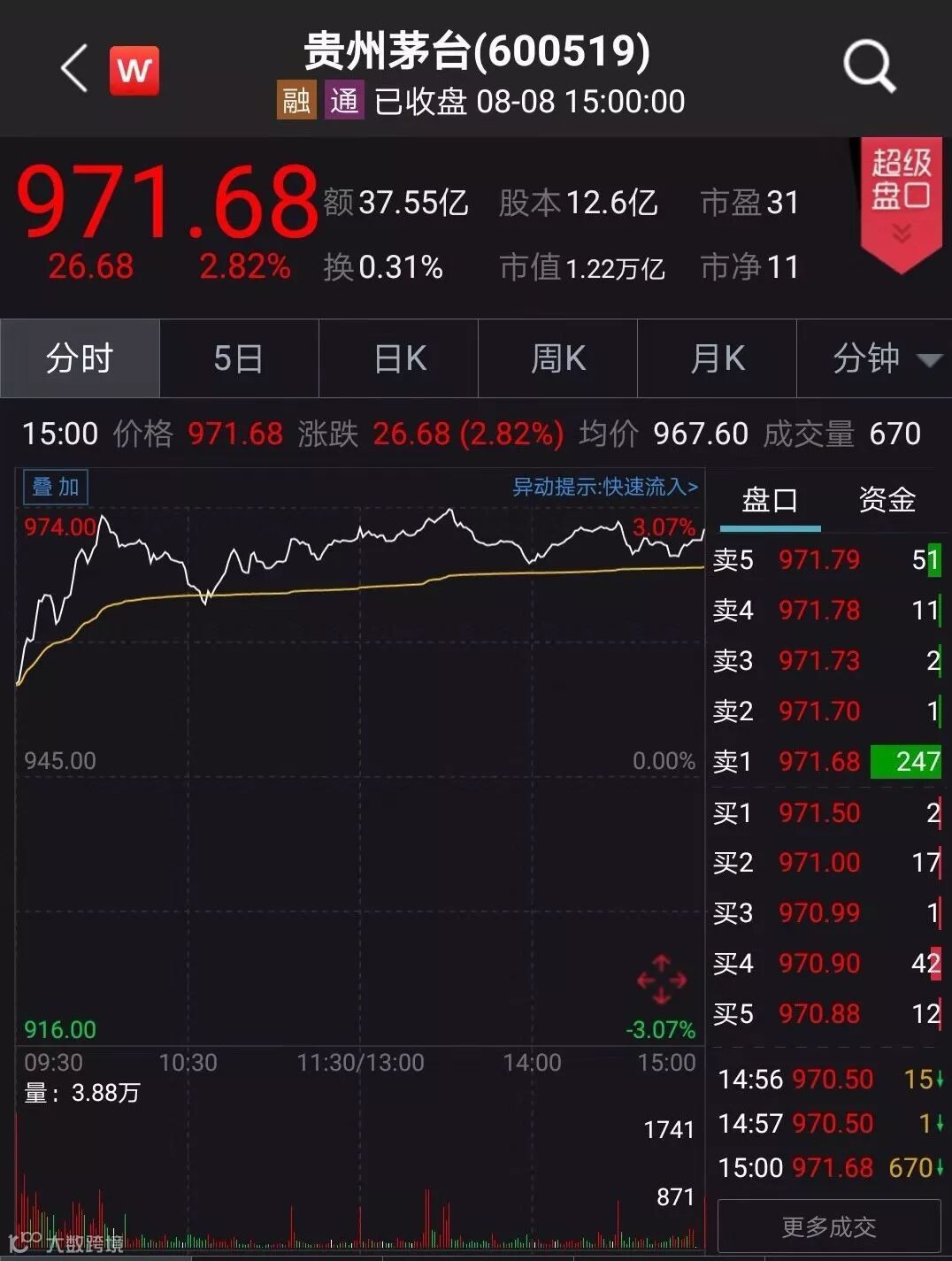 8月8日,贵州茅台股价收涨2.82%,收报971.68元/股,成交额达到37.55亿元。