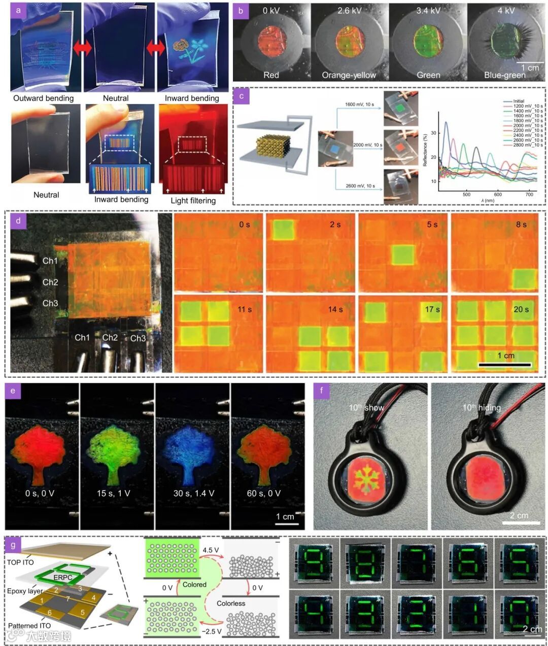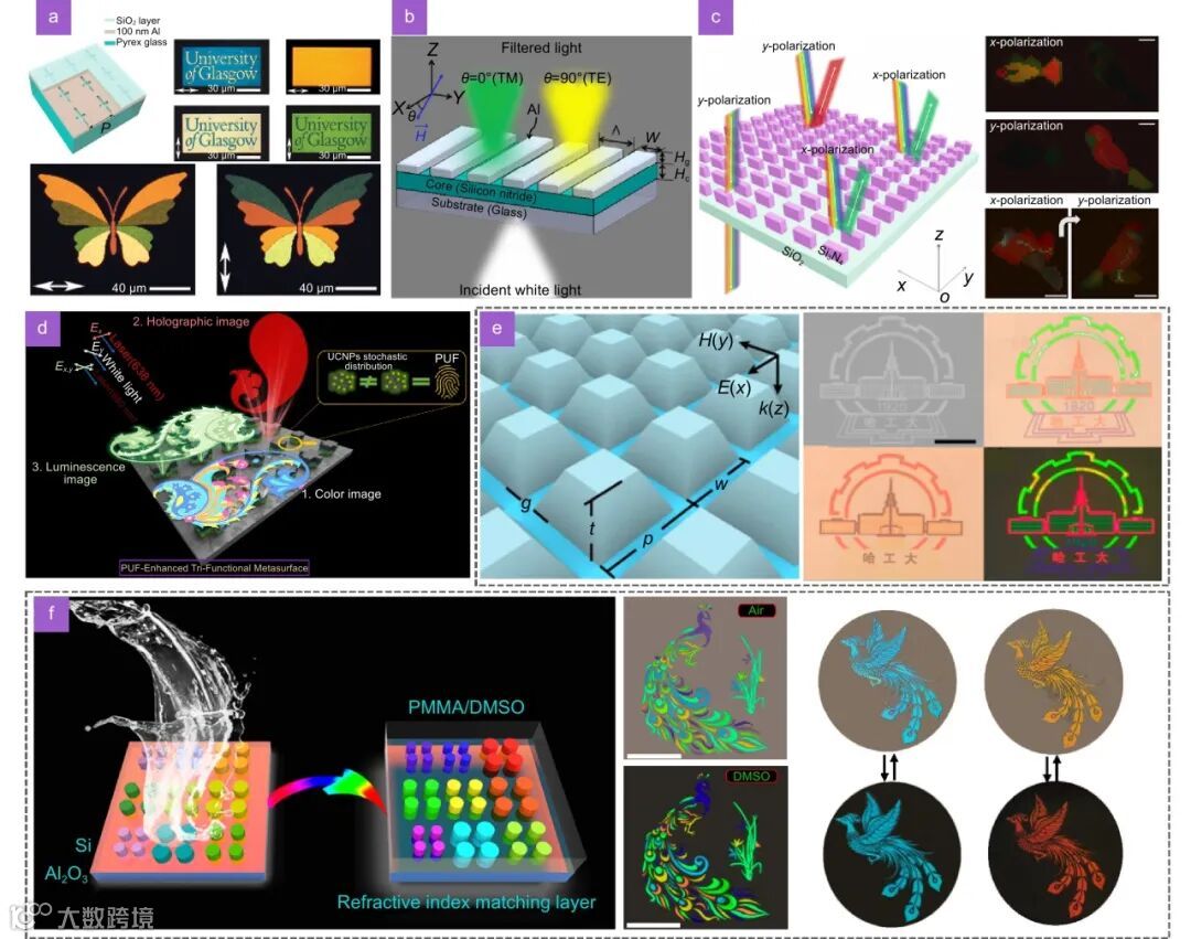 在结构色制备领域,从维度上可划分为从1D、2D到3D的演化进程,从制造方法上可分为自下而上、自上而下和二者相互结合的手段,其包括超表面、光子晶体、法布里珀罗空腔、等离激元共振和胶体晶体光子晶体等。以超表面为代表的结构色,具备色彩调控自由度高、信息密度大、色彩通道维度多的特点,广泛用于防伪和印刷,如图2所示;胶体光子晶体作为典型的自下而上结构色的代表,可以开发一系列响应性结构色器件,例如力响应、磁响应、热响应和电响应等,可以实现动态的结构色显示(如图3所示)。