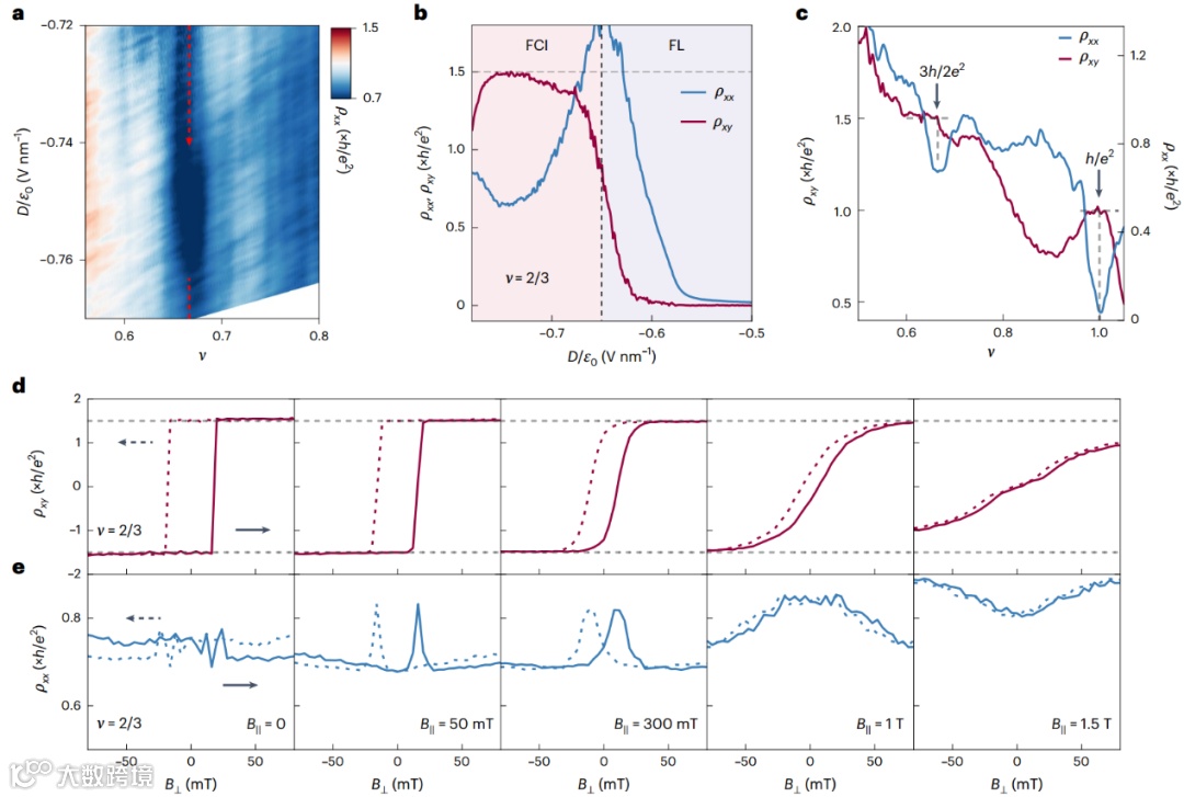 近日,北京大学的卢晓波助理教授课题组与北京科技大学的刘健鹏副教授课题组合作,聚焦于菱形六层石墨烯(RHG)与hBN构成的莫尔超晶格体系,通过实验与理论结合揭示了其整数与分数量子反常霍尔效应的共存及调控规律。研究团队利用双门电压调控载流子密度和位移电场,在零磁场条件下观测到陈数为1的整数量子反常霍尔态(IQAHE),其霍尔电阻ρxy精确量化至h/e2(精度>99.5%),且纵向电阻ρxx趋近于零。进一步通过调节位移电场与垂直磁场,在填充因子ν=2/3处发现了分数量子反常霍尔效应(FQAHE),其霍尔电阻稳定在3h/2e2,并伴随ρxx的显著下降。尤为重要的是,该分数态在磁场诱导的相变中表现出鲁棒性:当垂直磁场超过临界值时,系统发生霍尔电阻符号反转,但ν=2/3的分数态仍保持量化特性。理论计算表明,莫尔势对拓扑平带的形成至关重要,即使在高位移电场下将电子推离莫尔界面,仍需100%强度的莫尔势才能打开陈绝缘体的能隙。此外,研究通过对比六层与五层石墨烯体系的阈值电场差异,揭示了层数对有效相互作用强度的影响,为设计新型拓扑量子材料提供了关键见解。这一发现不仅扩展了分数陈绝缘体的材料家族,还为通过电场、磁场及莫尔工程调控分数量子态提供了新思路,有望推动分数量子电荷与非阿贝尔统计的实验探测。该成果发表于《Nature Materials》。(刘梦洋)