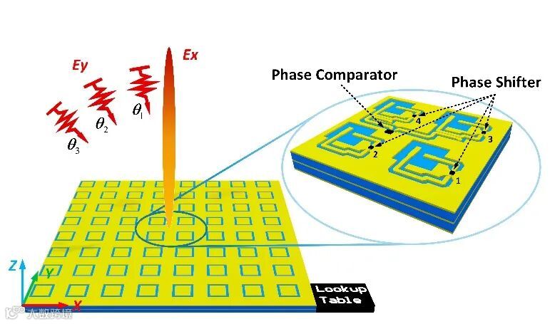图1. 自适应超表面对未知入射电磁波入射方向的检测与反射方向的调控。