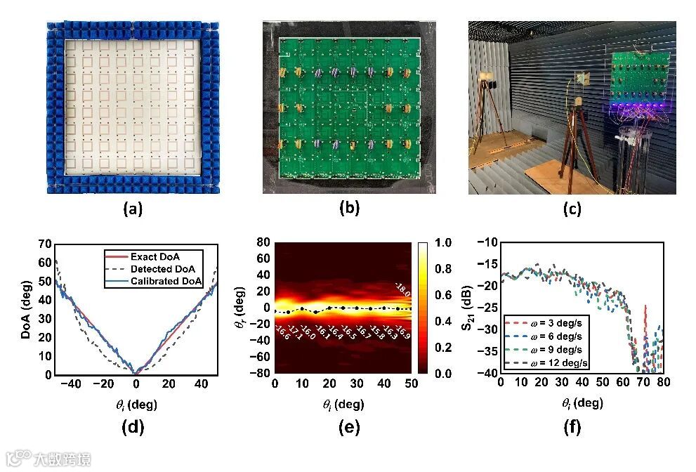 图3. 超表面的实物的正面(a)与背面(b)。(c)微波暗室中的双天线超表面测试环境。(d)±50˚以内的入射角检测。(e)垂直反射功能下的反射波能量分布图。(f)不同入射角速度下的法向反射强度曲线。