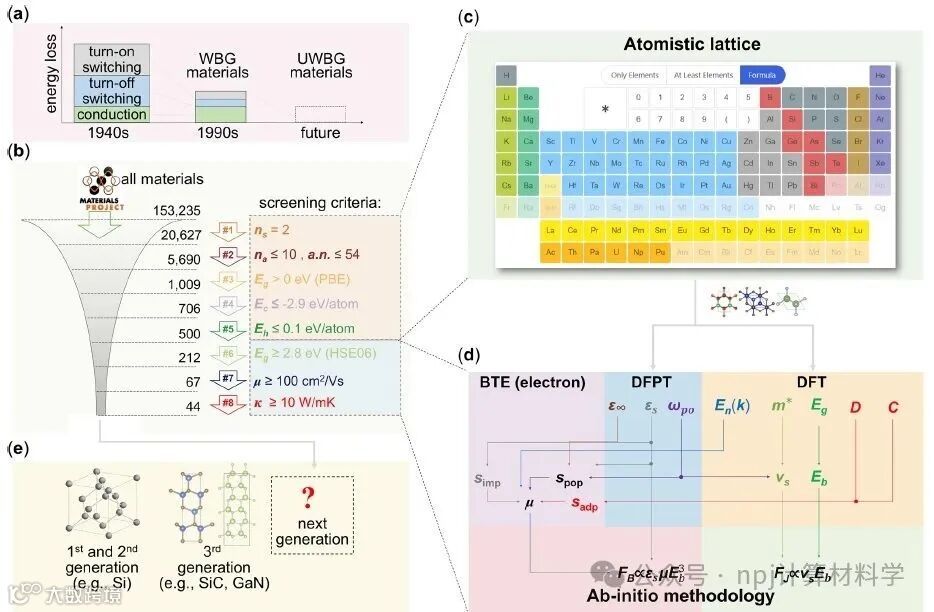 Fig. 1 | Schematic diagrams illustrating the discovery of wide-bandgap (WBG) semiconductors, and a flowchart of the proposed ab initio screening methodology.