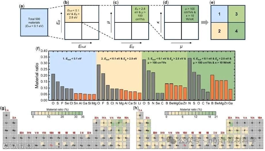 随后,该研究为了进一步了解宽带隙(WBG)材料的元素含量,系统地评估了500种候选化合物的元素组成。根据它们的hull能量(Ehull)、带隙(Eg)、电子迁移率(μ)、热导率(κ)分为四个不同的组,见图4。通过系统性地分析得出结论,宽带隙(WBG)材料优先考虑两种不同的组成策略,即强电负性阴离子(O、F、S、N、Cl)和低电负性阳离子(如Li、Mg)。值得注意的是,具有优良的电子迁移率和热导率(μ>100 cm2/Vs,κ>10 W/mK)的化合物趋向于由相对原子质量较小并且价态较低的阳离子组成(B、Be、Mg、Ga、Zn),因为它们降低了轨道复杂性并抑制了电子-声子散射。