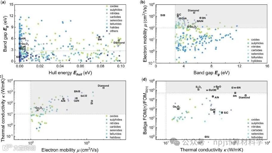 Through first-principles high-throughput computing, the team intelligently screened over 150,000 materials, employing a multi-dimensional evaluation approach based on bandgap, electron mobility, thermal conductivity, and Baliga/Johnson figures of merit (BFOM/JFOM). They successfully identified three candidate materials, i.e., B₂O₃, BeO, and BN, as next-generation WBG materials. Key findings of the study: