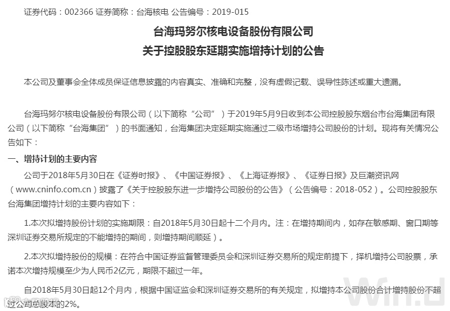 5月14日,台海核电公告,台海集团由于市场融资环境发生变化延期增持计划履行期,原计划2019年5月30日完成,现在延期为2020年5月30日。
