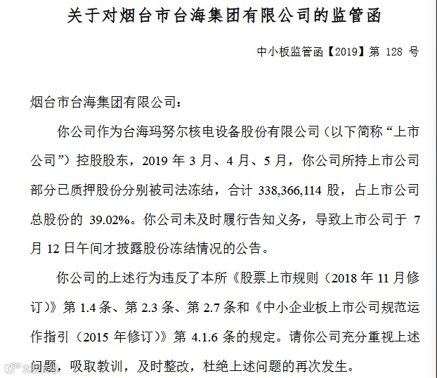 7月12日,公司公告称,控股股东烟台市台海集团有限公司所持大部分股票均已被司法冻结。