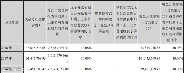 从过去几年历史来看,公司一直保持着稳定的分红政策,每年分红比例占当年实现的可分配利润的比例一直稳稳地保持在10%。