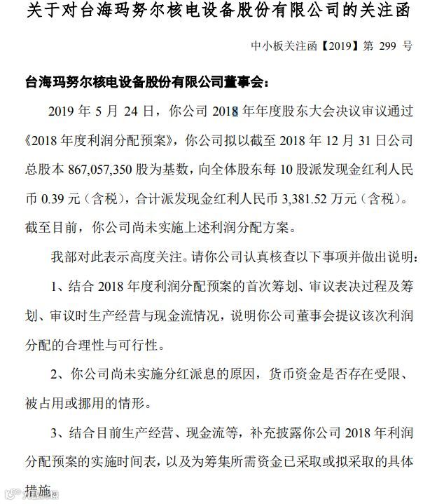 历史上台海核电就有分红逾期的记录。公司2017年度的利润分配方案在2018年5月18日的股东大会上审议通过,一直到2018年9月才完成了现金分红。
