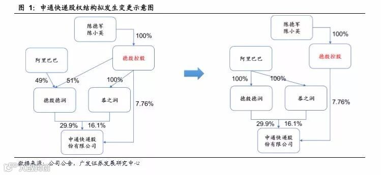 7月2日,申通快递公告称,德殷投资将其持有的德殷德润49%股权转让给阿里巴巴,支付对价为46.65亿元。