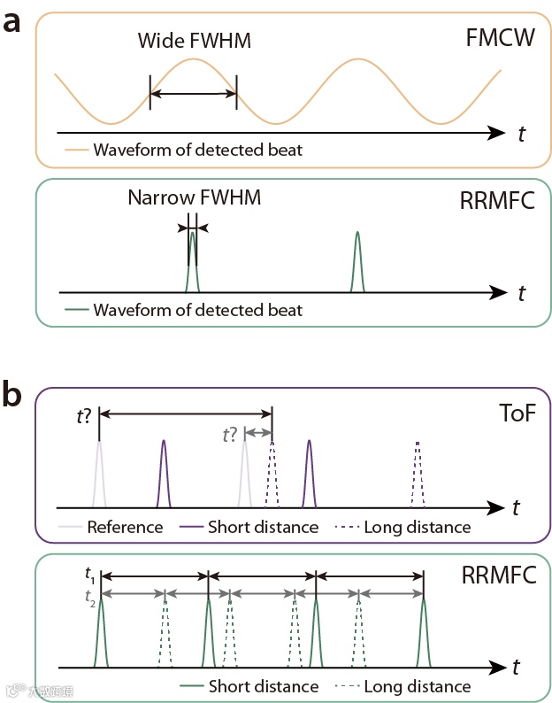 不受方法限制的非模糊范围。与ToF类系统相比,RRMFC的原理基于扫频相干探测,因此绝对距离测量范围在相当程度内不受方法本身限制(图2b)。