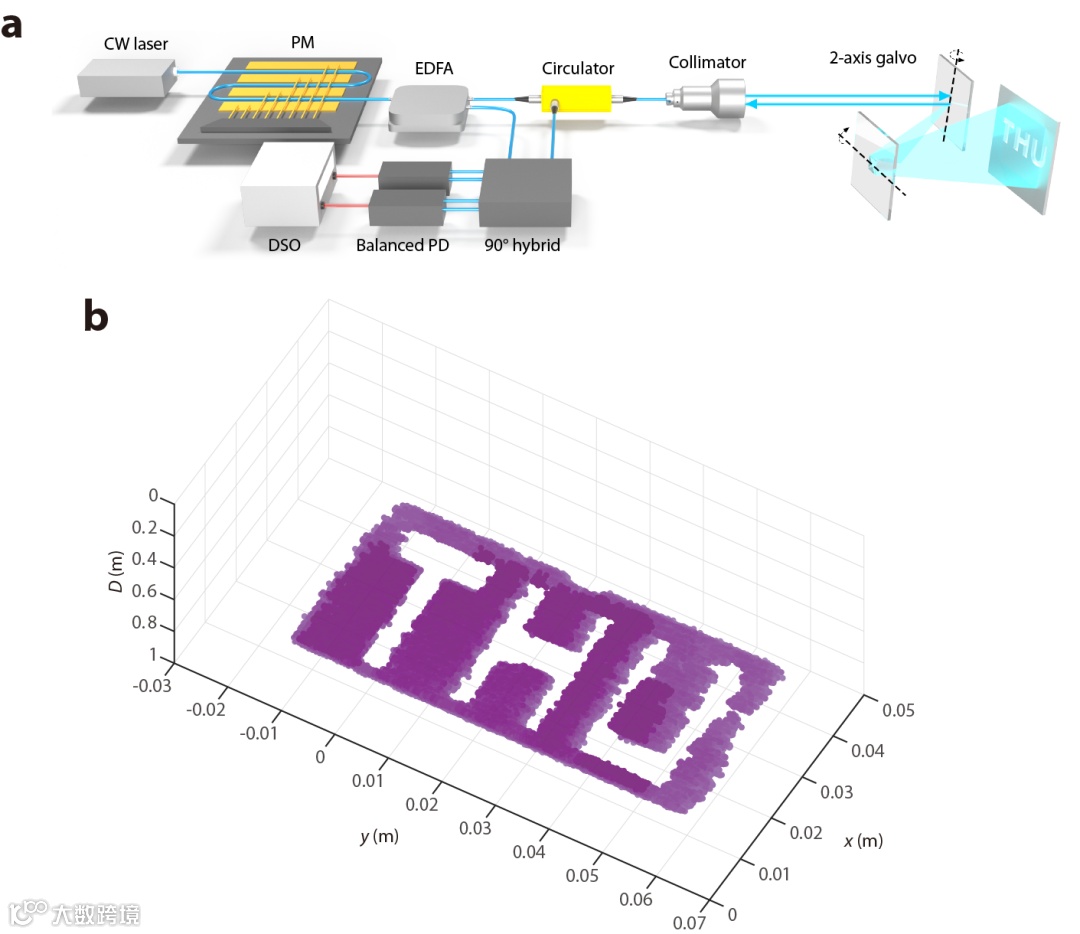研究团队还开展了面向三维环境感知的实验。在实验中,信号光路的光借助于二维振镜被发射到空间中的各个方向。测距光路中放置了一个刻有“THU”字样的未经抛光的铝板(图5a)。实验中利用单一通道的RRMFC距离测量系统开展了三维的距离测量,测量结果如图5b所示。得益于RRMFC的高速测量能力,实验中实现了高达3 MP/s的单通道点频,这一点频数据已经超越了当前多通道激光雷达系统的总点频,且与RRMFC的理论采集率相比仍有很大的提升空间。和传统激光雷达相比,本方法在相同刷新率下的距离测量精密度提升超1个数量级。
