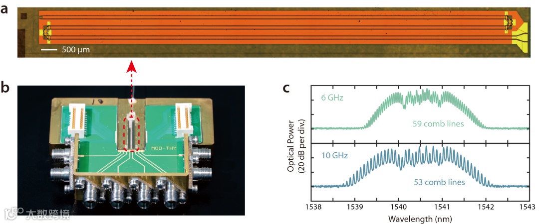 得益于简单且有效的结构设计,这一电光频梳在重复频率调谐过程中不仅可以实现无限制的调节范围,还可以实现在调节过程中梳齿数量保持稳定、平滑变化。 器件加工主要是在研究团队加工平台中完成的。图3b展示了封装后的相位调制器电光频梳,该器件可以实现在6 GHz下59根梳齿生成,并平滑过渡到10 GHz下的53根(图3c)。