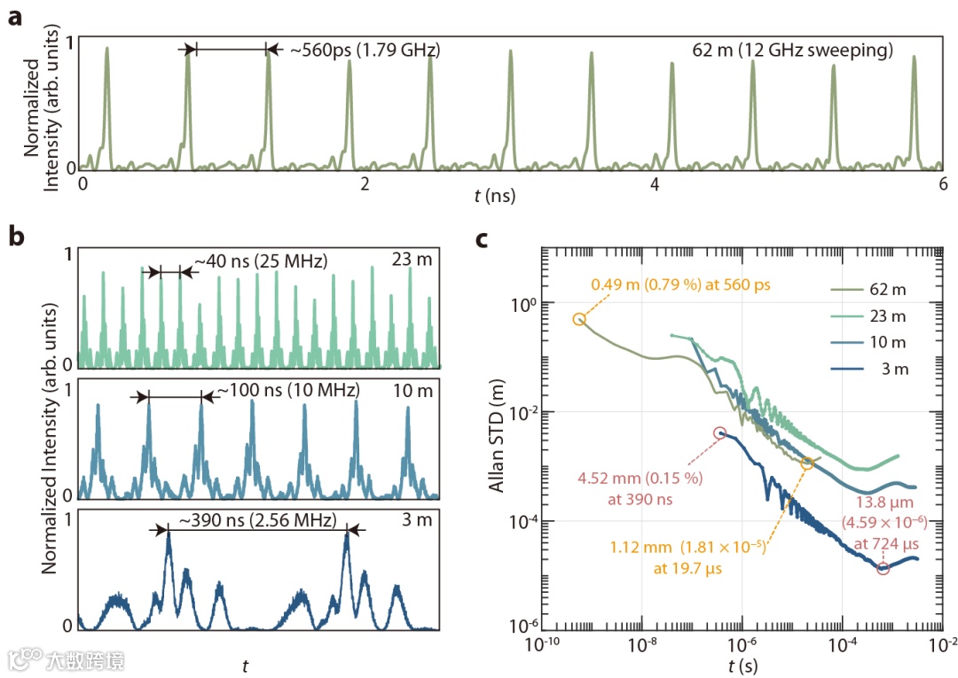 研究团队利用加工完成的相位调制电光频梳开展了距离测量的实验验证工作。实验中设计了针对不同距离目标、使用不同扫频范围和扫频频率的验证。在针对62 m目标距离的验证中,测得最高测距刷新率达到1.79 GHz(图4a)。测距刷新率随着待测距离的增长(图4b)、扫频的范围和速度的提升而提升。图4c展现了测距阿伦方差的实验结果,针对于各距离、各扫频范围和速率的结果均能实现最小相对阿伦方差达到 10−5量级;在3 m距离测量中可以实现的最小阿伦方差达到了13.8微米。