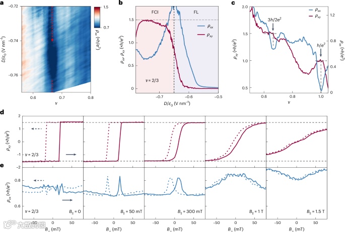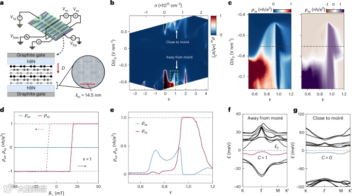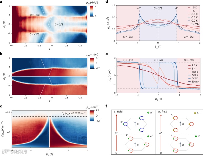 (2)实验通过调控电场和磁场在0<ν<1的莫尔填充因子范围内,观察到了霍尔电阻率在有限磁场下符号反转的相变现象。特别是在ν=2/3的分数陈绝缘体态下,量子化的霍尔电阻率在不同相之间保持一致,展现出强稳定性。