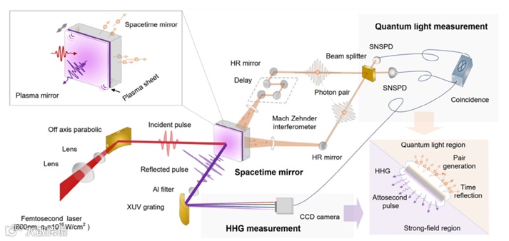 图2:量光测量与强场高次谐波产生 (HHG) 联合测量的示意图。相对论性激光与涂覆金属薄膜的二氧化硅靶相互作用,激发相对论性振荡镜 (ROM) 作为时空镜的行为。在强场区探测到高次谐波,而在靶背面,时空镜产生的光子对则通过高次谐波干涉装置探测到。反射的高次谐波光谱和光子对通过符合测量同时成像。(左图)相对论性激光使靶表面完全电离,并促进致密等离子体的形成,从而形成时空镜。(右图)该时空镜可以在强场区产生高次谐波,并在量子光区挤压介电真空电磁场,产生纠缠光子。
