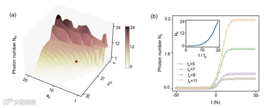 图3:光子对产生的特性,体现在激光强度、等离子体密度和相互作用时间(激光脉冲宽度)等物理参数方面。a) 激光强度越高,产生的光子对越多;等离子体密度越低,光子数量越多,也越有利于光子对的产生。激光脉冲宽度选择为 10TL。b) 相互作用时间越长,产生的光子越多,光子数量也随着脉冲宽度的增加而呈指数增长(子图)。具体而言,随着脉冲宽度从 4TL 增加到 12TL,光子数量从 0.1 增加到 4。