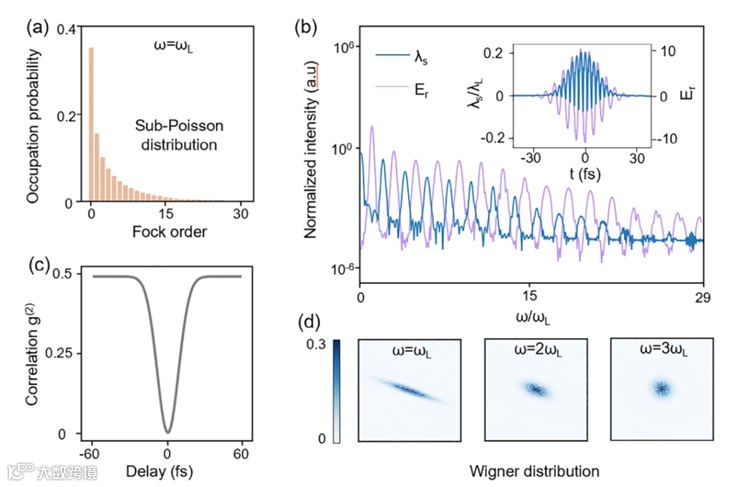 图4:时空镜产生量子光和高次谐波的共同起源。a) 频率为𝜔 = 𝜔L的量子光的Fock态分布呈现亚泊松分布。b) 谐波产生的阶数为奇数,而等离子体振荡为偶数。这种区别是由于高次谐波将等离子体片振荡频率与驱动频率相结合而产生的。c) 展示了HOM干涉测量g(2)的特性。当两臂之间没有延迟时,g(2)的下降特征表明两个发射光子是纠缠的。d) 展示了维格纳函数表示中1-3阶谐波的压缩真空态的特征,阶数越高,压缩效应越弱。