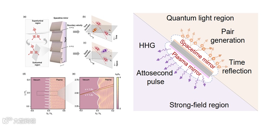 该研究成果以题为“Superluminal Spacetime Boundary, Time Reflection and Quantum Light Generation From Relativistic Plasma Mirrors”发表在《Laser & Photonics Reviews》(DOI: 10.1002/lpor.202401986)上,第一作者为上海科技大学与上海光机所联合培养博士生潘晨浩,通讯作者为上海科技大学潘义明教授,中国工程物理研究院王少义副研究员以及上海光机所冷雨欣研究员。