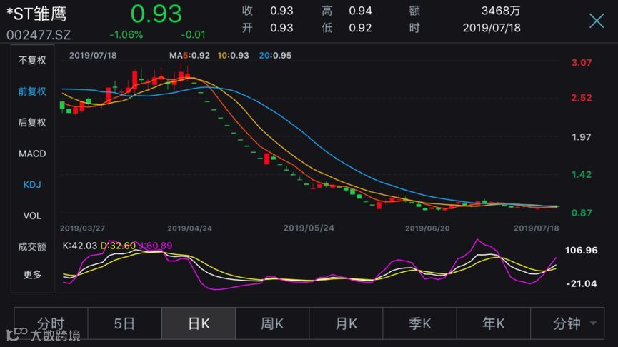 自4月25日*ST雏鹰因2018年年报“非标”被实行退市风险警示后,公司在随后18个交易日获17个跌停,而后股价一路下跌至0.95元并一直在1元左右徘徊。