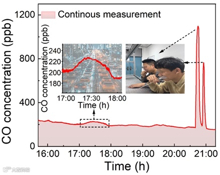 最终,研究人员开展了该传感器在城市环境监测和人体健康评估中的初步应用探索,如图6所示,CO作为人体代谢的微量副产品,可作为评估人类肺部健康的重要指标。