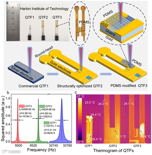 图3:聚合物改性的圆形头低频石英音叉: (a)石英音叉优化示意图;(b)石英音叉频率响应;(b)石英音叉热像图