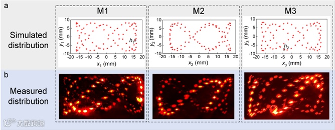 图2:三片镜光斑图案: (a)仿真光斑分布;(b)实测光斑分布