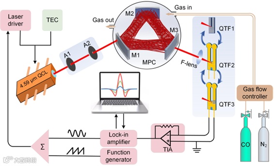 实验装置图如图4所示,选用一氧化碳(CO)气体验证传感器性能,选用中红外分布反馈量子级联激光器覆盖CO在4587.64 nm的强吸收线,对不同音叉的传感性能进行对比,基于 PDMS 改性圆形头低频石英音叉的CO-LITES传感器信噪比相比商用音叉提升10.59 倍。