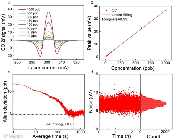 图5:基于优化多通池和石英音叉的CO-LITES传感性能测试: (a)不同CO浓度下2f信号曲线;(b)浓度线性响应;(c)Allan方差分析;(d)噪声连续检测