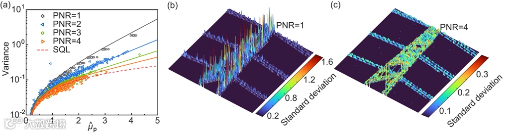 图4. 反射率测量能力研究。(a):不同光子数分辨能力下的估计方差与SQL的对比。(b):PNR=1 detection (on/off detection)估计标准差的空间分布。(b):PNR=4 detection估计标准差的空间分布。
