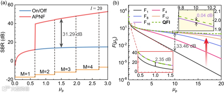 图2. 信噪比特性与Fisher信息获取能力。(a):信号背景比(SBR)对比。(b):测量的Fisher信息与量子Fisher信息的对比。