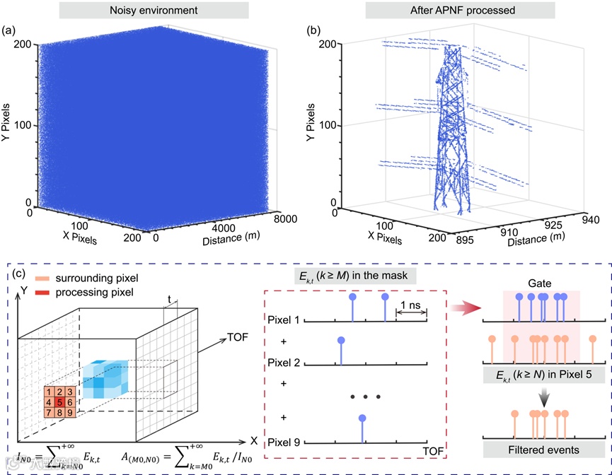 图3. 使用APNF进行光子点云处理。(a):强烈背景噪声环境下获取的原始光子点云。(b):APNF处理后的三维点云。(c):APNF算法执行流程示意图。
