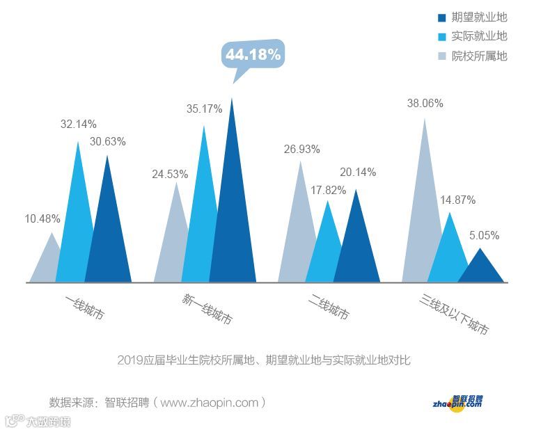 据智联招聘2019年大学生求职指南数据显示,2019应届毕业生期望就业地比例最高的依旧是“新一线”城市(如杭州、宁波、天津、南京等),占比为44.18%,同比上升4.00个百分点。一线城市吸引力也在上升,30.63%的受访大学生期望在一线城市就业,占比高于去年,不管顶着多大的生存压力,一线城市依然是年轻人追逐梦想的主要战场。结合实际签约的数据看,占比最高的也是“新一线”城市:如,占比35.17%,一线城市签约占比为32.14%,与期望结构一致。