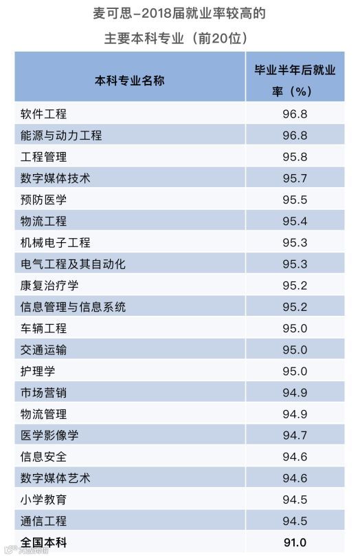 而第三方社会调查机构麦可思研究院日前发布的《2019年中国大学生就业报告》的最新数据显示,2019就业率最高本科专业为,软件工程专业和能源与动力工程专业就业率最高,均为96.8%,其后是工程管理专业(95.8%)。其中,信息安全、软件工程、网络工程、通信工程、数字媒体艺术蝉联三届。在2015年高考志愿热门专业中仅车辆工程、通信工程、还榜上有名,就业率分别在95%和94.5%,位列第11名和20名。