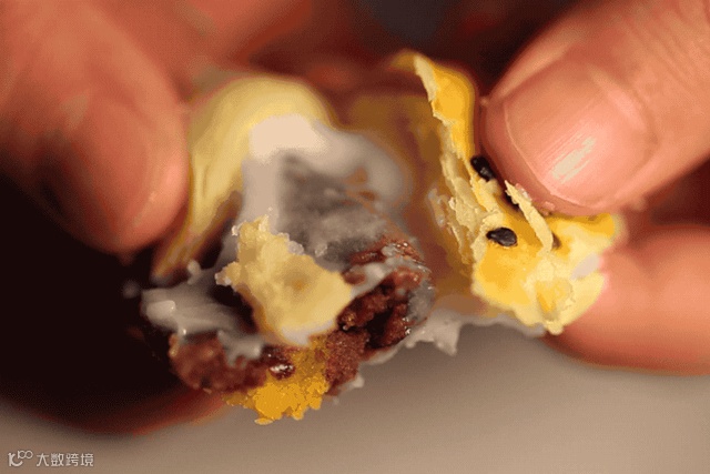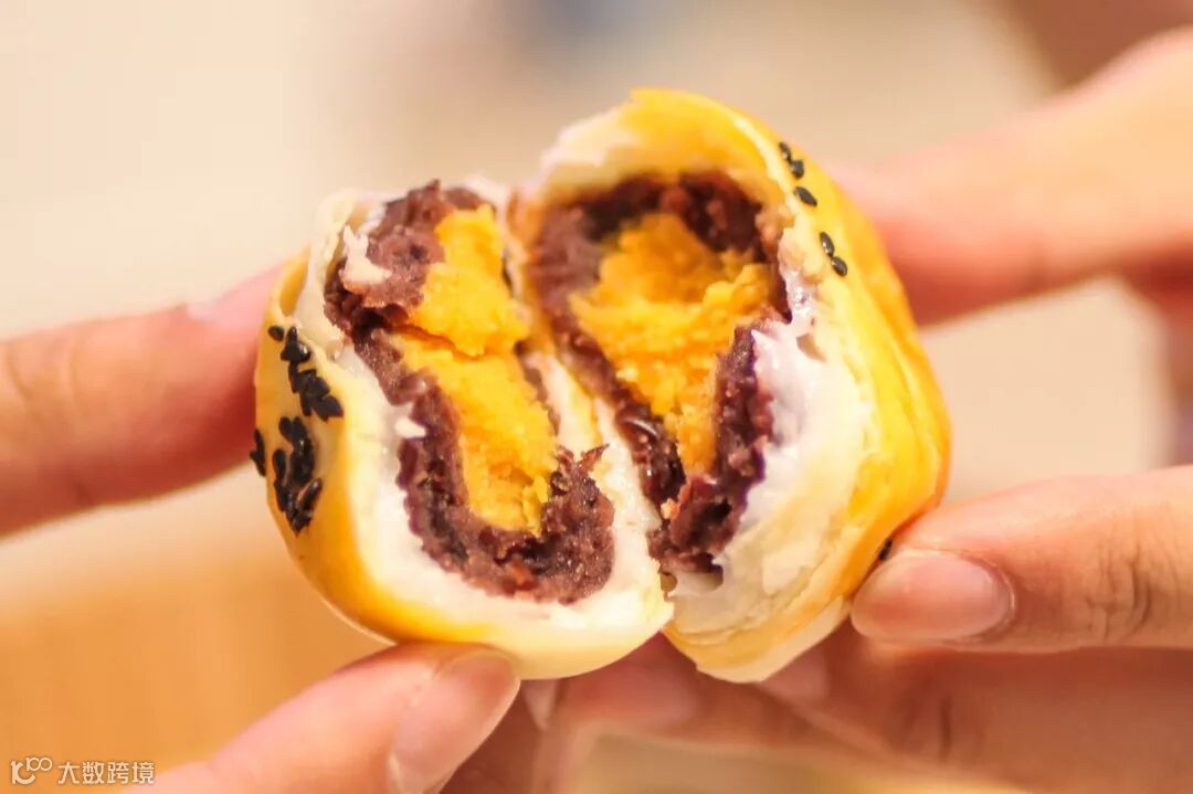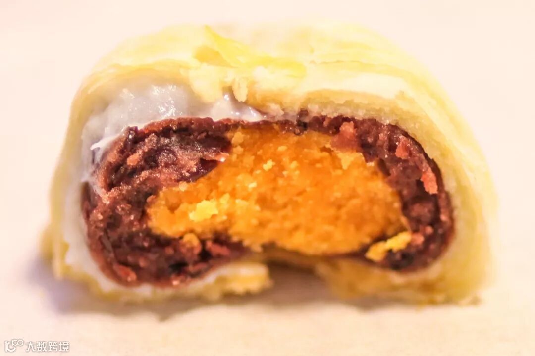 你看它从外到内足足4种食材:7层酥皮、Q弹的雪媚娘、绵密的红豆沙、咸香的鸭蛋黄。